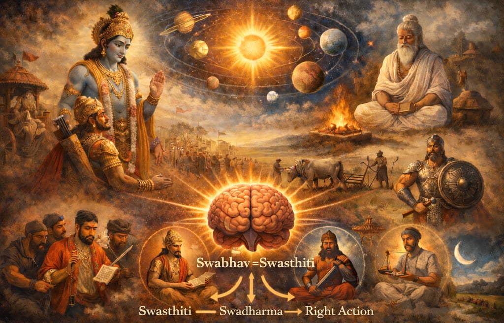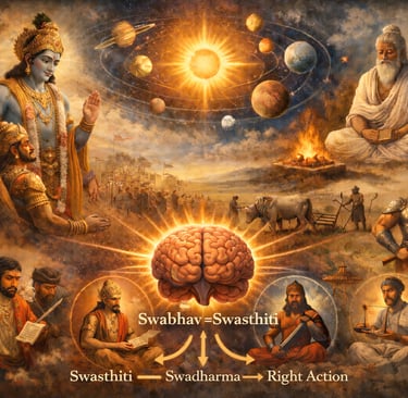 In Discourse 15, Shri Krishna says पृष्णामि औषधीः सर्वाः सोमो भूत्वा रसात्मकम् — I nourish all the vegetation and brains by becoming moon energy frequency ( रस् also means a deep sound frequency which converts into a nourishing liquid energy in vegetation and brains through a subtle series of cause and effect ). Waxing and waning of the moon define its role of modulating the solar energy emissions to the earth. Now this particular स्थिति of the moon mandates certain direction (दिशा) to do its job that direction born out of its स्थिति is its स्वभाव or स्वस्थिति. Working out its job in that direction by its स्थिति doesn’t get it any negatives. Now what the sun, the moon and all the planets are doing is स्वभावनियतं कर्म — job decided by their particular placements in the solar system. Krishna says working as per that स्वभाव doesn’t result in negativities— कुर्वन्नाप्नोति किल्बिषम्. Understand Swasthiti Now all the movable and immovable created ones live in separate groups having similar स्थिति ।